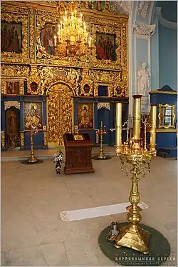 In the church, the wooden sculpture Crucifix is especially revered – it is already more than three hundred years old.[57] A four-tiered iconostasis rises in front of the wall separating the altar from the church. In the decoration of the iconostasis there are a variety of plant and ornamental patterns, in places with sculptural images of the Angels. The iconostasis is filled with ancient icons surrounded by gilded carvings. Icons perfectly harmonize with the carved part of the iconostasis. Eleven icons out of twenty-six, that were previously in the iconostasis, preserved.[58] The Icon of the Sign of the Most Holy Theotokos is especially revered in the church and is a copy of the storied Novgorod Icon of Our Lady of the Sign (1170). Architectural historian M.V. Krasovsky described the iconostasis of the church as follows: "In its marvelous fabulousness and high technology, it surpasses all the iconostases in the Russian Baroque that only I have ever seen ...".[49]
