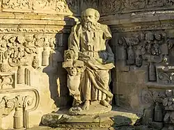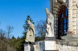 Near the ground, in the corners of the basement, are located, now badly damaged, the statues of the Four Evangelists: Mark, Luke, Matthew and John. The statues are artistically executed, but in general they are all disproportionately short.[47] The sculptural objects at the feet of the Evangelists reproduce one of the incarnations of Tetramorph (a mythical winged demon from the visions of the Prophet Ezekiel). Tetramorph appears in the form of four living creatures: an Angel, a lion, a calf and an eagle, which guard the four corners of the Throne of the Lord and the four borders of Paradise.